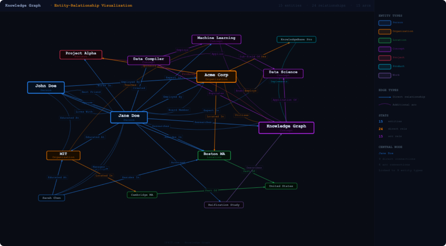 Predicate: The descriptive relationship label that explains the nature of the connection between nodes (e.g., “Spouse,” “Resident Of,” “Product Owner”).