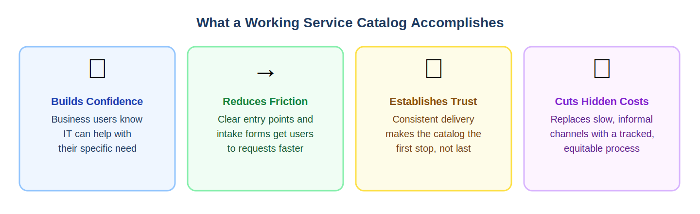 It establishes trust through consistency. When business stakeholders submit requests and consistently receive what the catalog described--within the timeframes stated, with the process outlined--the catalog becomes trusted. Trust, once established, is self-reinforcing. It makes the catalog the first stop rather than the last resort.