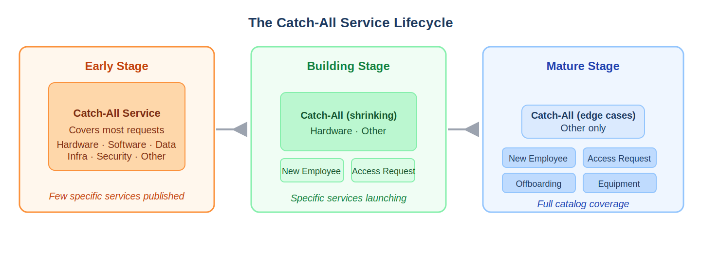 The catch-all never goes away entirely--there will always be edge cases and new needs that precede formal catalog coverage. But its scope narrows progressively as the catalog matures, which is exactly the right direction of travel. Think of it as scaffolding: it holds the structure together while the permanent work is being done, and unlike scaffolding, it continues to deliver value--capturing requests, generating demand data, and maintaining business confidence--throughout the entire build.