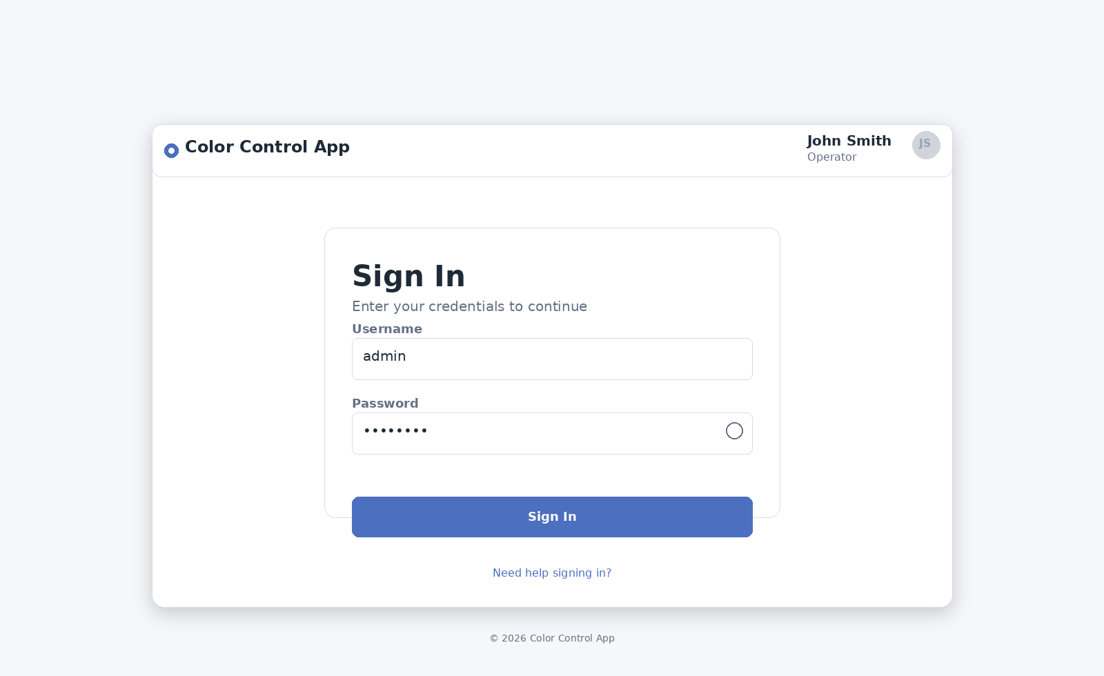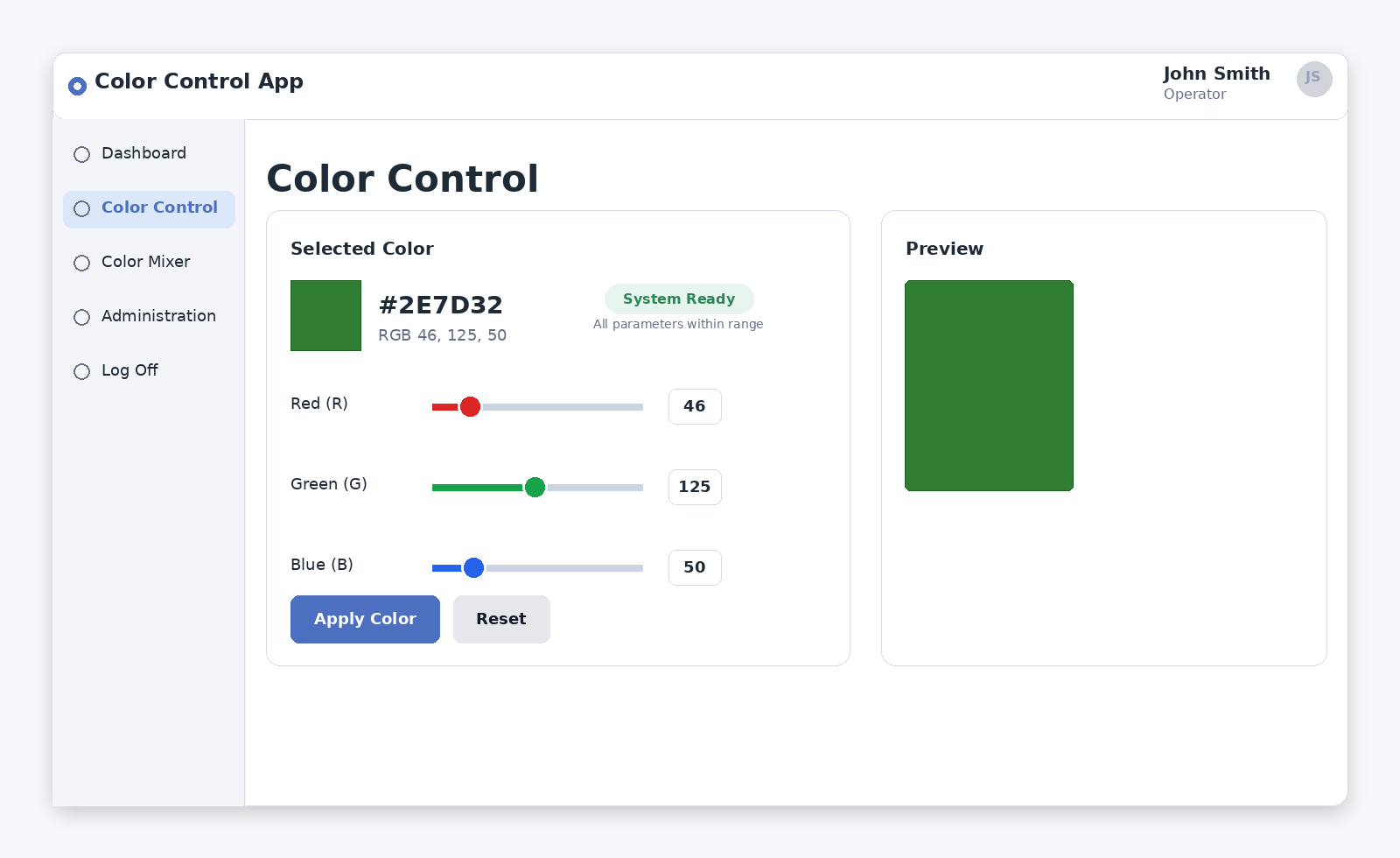 If John Smith (User) attempts to reach the Administrator Dashboard directly, the application immediately redirects him to the Color Control Page.