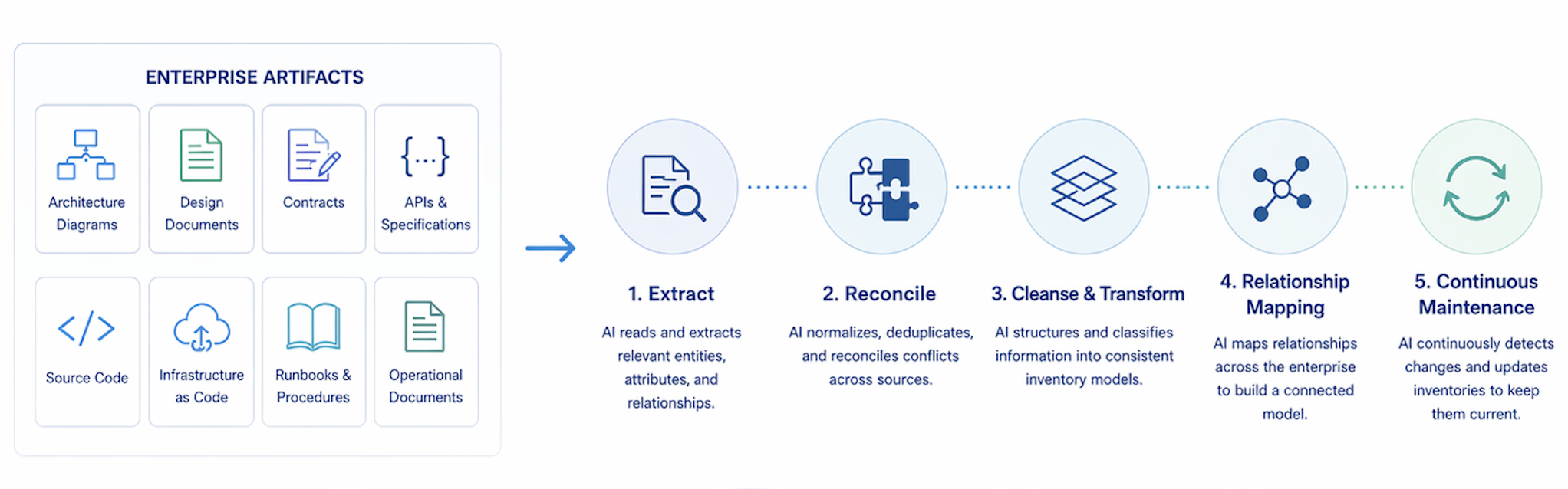 What follows describes five functions that, performed by human analysts using traditional tooling, would require significant teams, substantial development investment, and months of elapsed time — and would still produce results of uneven quality that begin decaying the moment they are complete. Performed by AI with NLRs, the same functions run continuously, cost a fraction of the equivalent human and tooling effort, and produce more consistent output because AI applies the same rules the same way every time — without fatigue, without the gaps caused by staff turnover, and without the tribal knowledge dependencies that make manual inventory programs fragile. Each function corresponds to a stage in the pipeline. Together they transform raw enterprise artifacts into a governed, relationship-rich Enterprise Model.