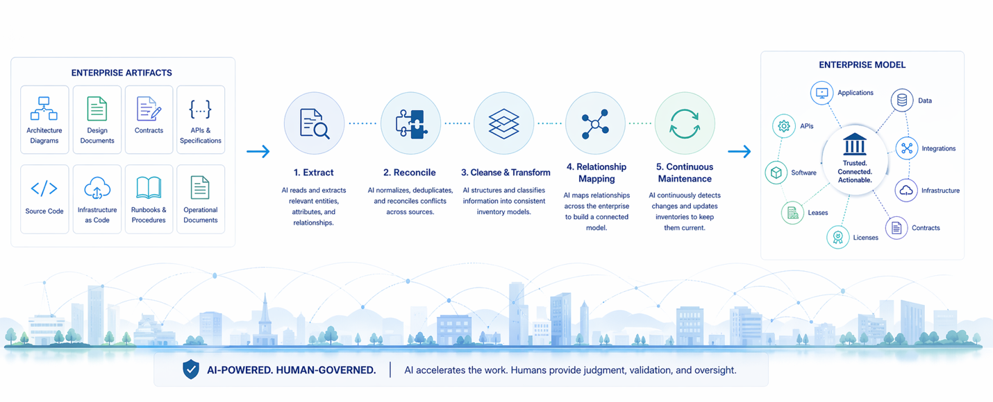 The challenge has always been building and maintaining those inventories at scale. The volume of artifacts that describe an enterprise — architecture documents, engineering diagrams, contracts, specifications, source code — is vast. The data within those artifacts is heterogeneous, inconsistently structured, and spread across organizational and system boundaries. And the enterprise changes continuously: new systems are built, old ones retire, integrations are added and modified, contracts are renegotiated. Any inventory program that depends on manual effort to keep pace with that rate of change will fall behind.
